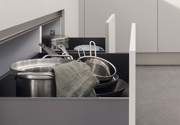 I cassetti LEGRABOX propongono un design innovativo, in cui funzionalità avanzata e purezza formale si incontrano. I fianchi sottilissimi, 12,8 mm di robustissimo acciaio verniciato opaco, fanno sì che si integrino armoniosamente con l’insieme. Le tecnologie di ultima generazione applicate al movimento assicurano massima scorrevolezza e facilità di apertura/chiusura.
